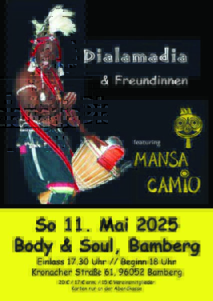 Der 61-jährige Meistertrommler Mansa Camio wurde in Baro, einem Dorf in Oberguinea, in der Familie der Schmiede geboren. Entsprechend seiner Berufsgruppe und seinen eigenen Interessen folgend, begann er schon im Alter von vier Jahren zu trommeln. Heute ist er initiierter Trommelmeister, spiritueller Würdenträger, Hüter des heiligen Waldes in Baro und Direktor der Trommelschule Ambada Sofoli in Guinea. Seit 1994 kommt er regelmäßig nach Europa, wo er als geschätzter Lehrer die traditionelle Trommelmusik der Malinke bis heute in ihrer ursprünglichen Form überliefert. Temperamentvolle Festmusik, die für Tänzer, Sänger, Masken und die Dorfgemeinschaft gespielt wird. Typisch "malinke": das Zusammenspiel der drei Basstrommeln Dununba, Sangba und Kensedeni, die den mitreißenden Trommelrhythmen ihren je spezifischen Charakter verleihen.